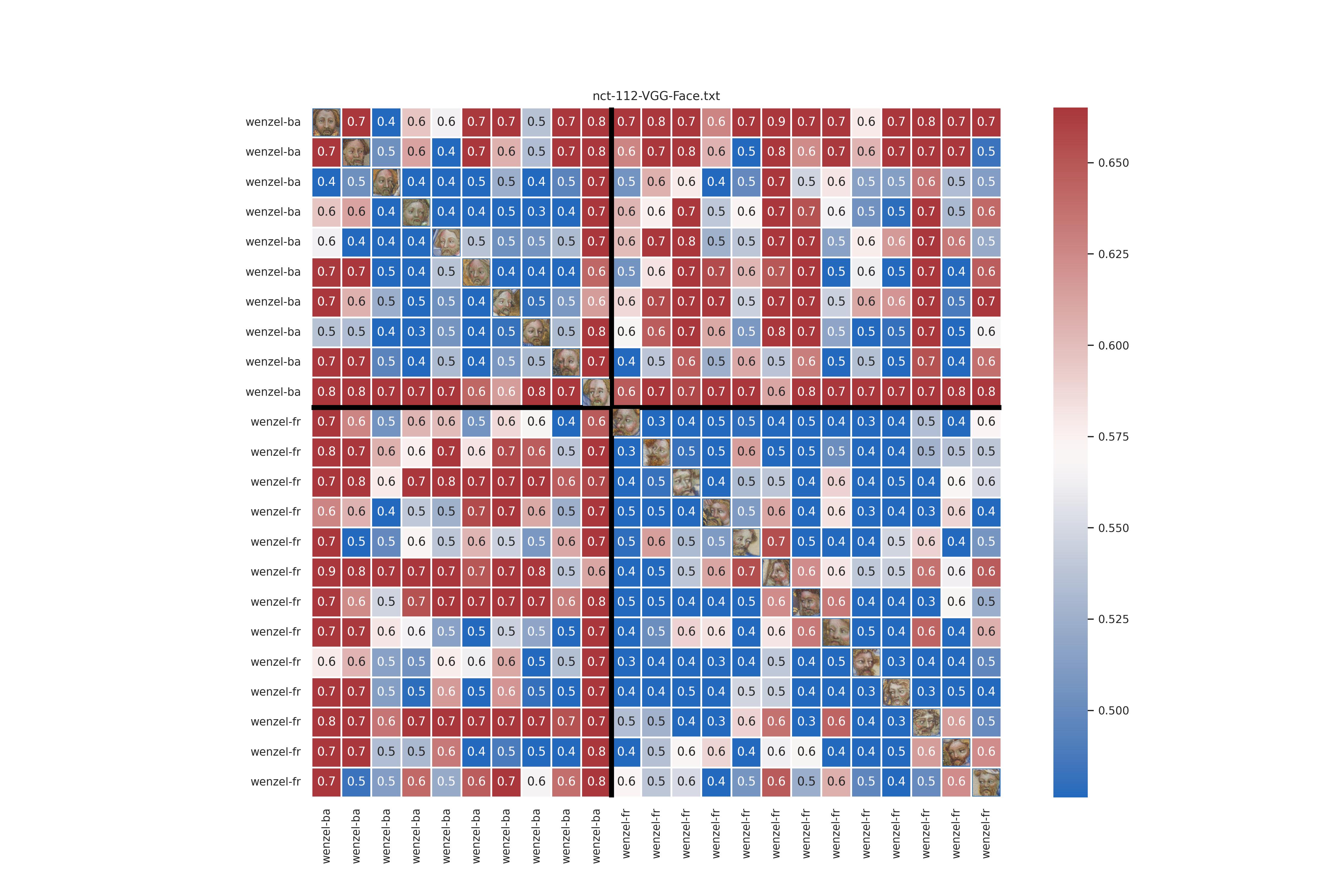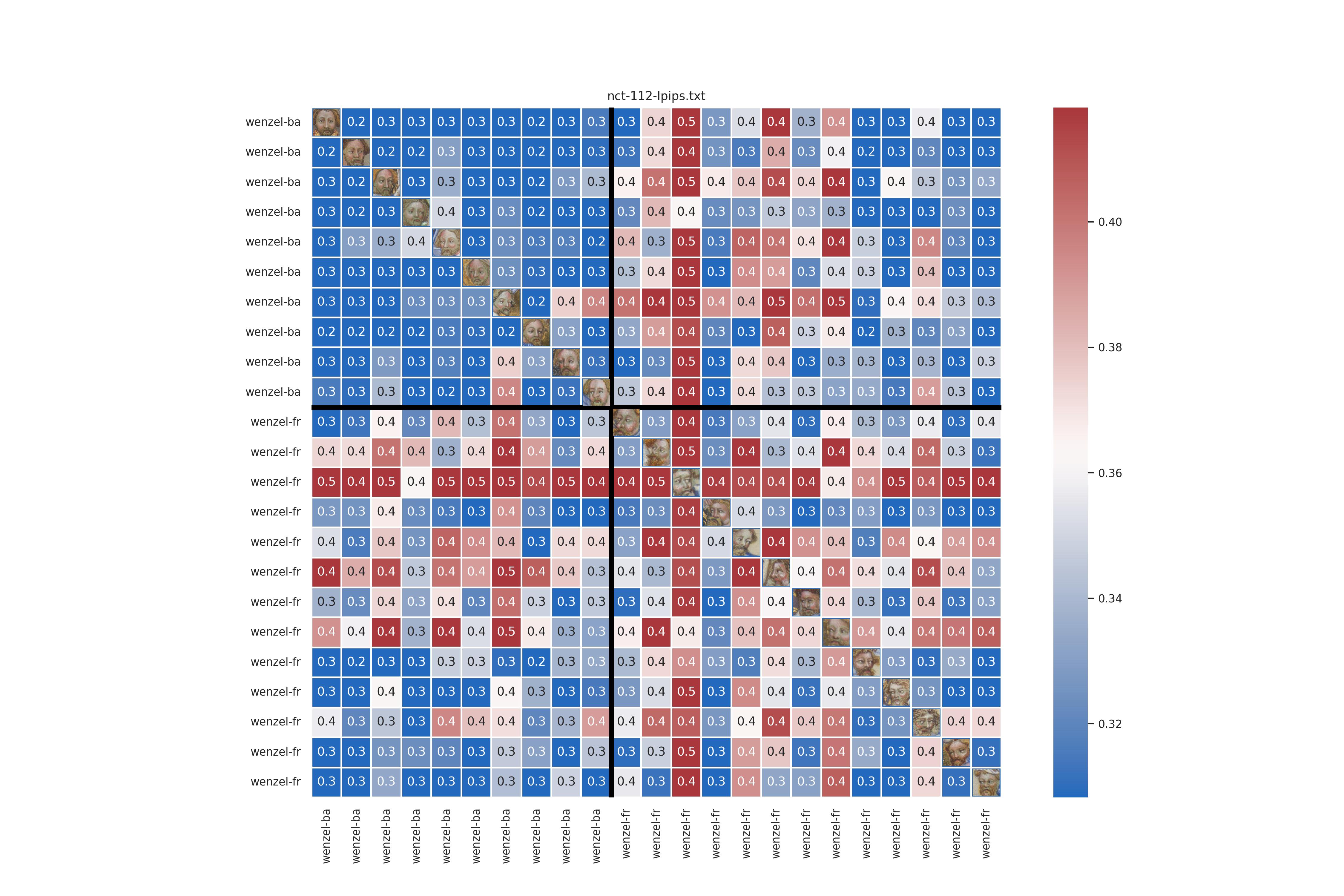 Same experiment with VGG-Face. Pretty much the reverse of the lpips results. Internaly cohesive Frana with less cohesive Balaam. Although it has to be said that intra Balaam looks more cohesive than inter comparisons.