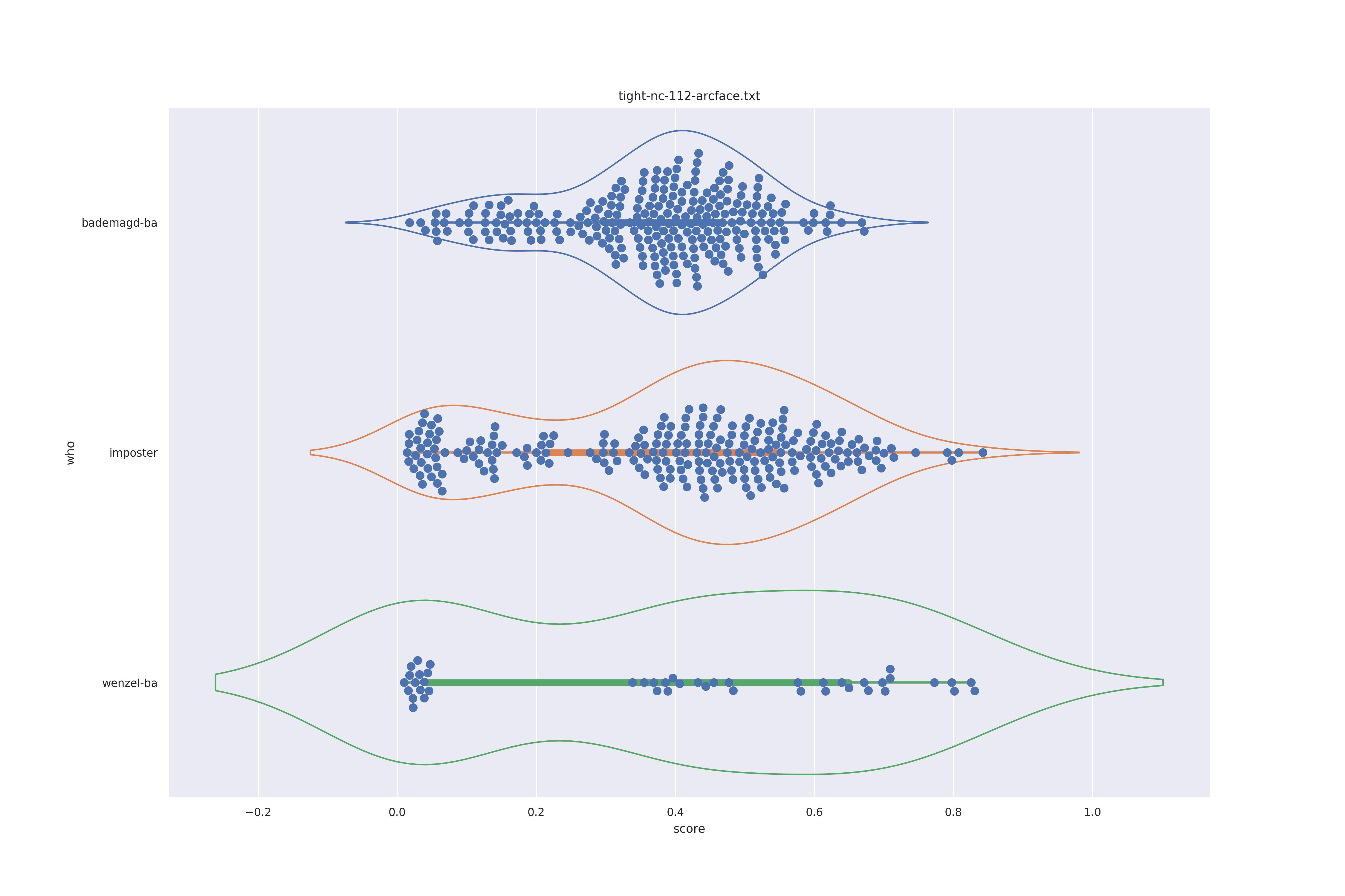 Not much different from SFace, they look all rather similar and no clear separation of imposter and wenzel distributions. Interestingly, no-context rather has some bademagd faces move away from the imposter distribution.
